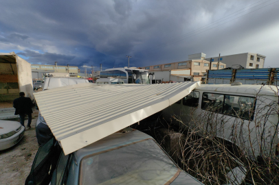 Lodosta uçan fabrika çatısı yediemin otoparkındaki araçlara zarar verdi