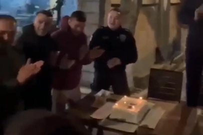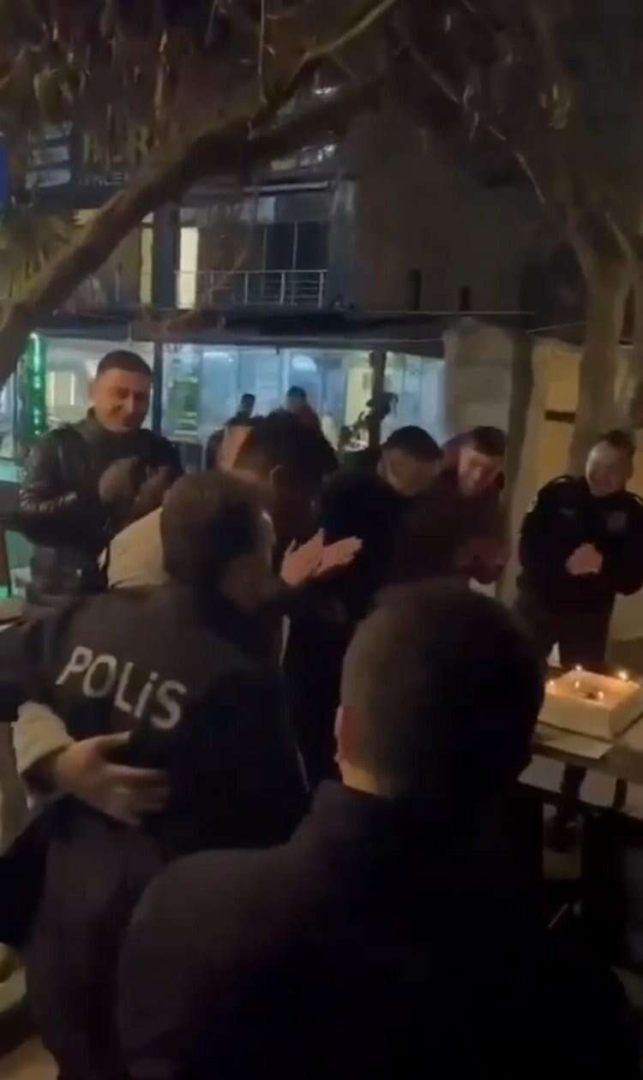 Yapılan pastalı kutlama sırasında duygulu anlar yaşayan polis memurunun o anları ise kameraya yansıdı.
