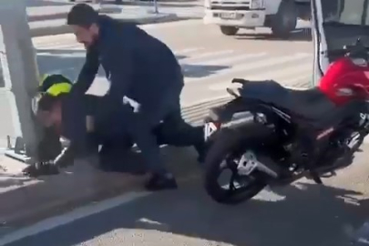 Bursa'da trafikte tartıştığı motosiklet sürücüsünü kaskıyla darp eden şahıs yakalanarak gözaltına alındı.