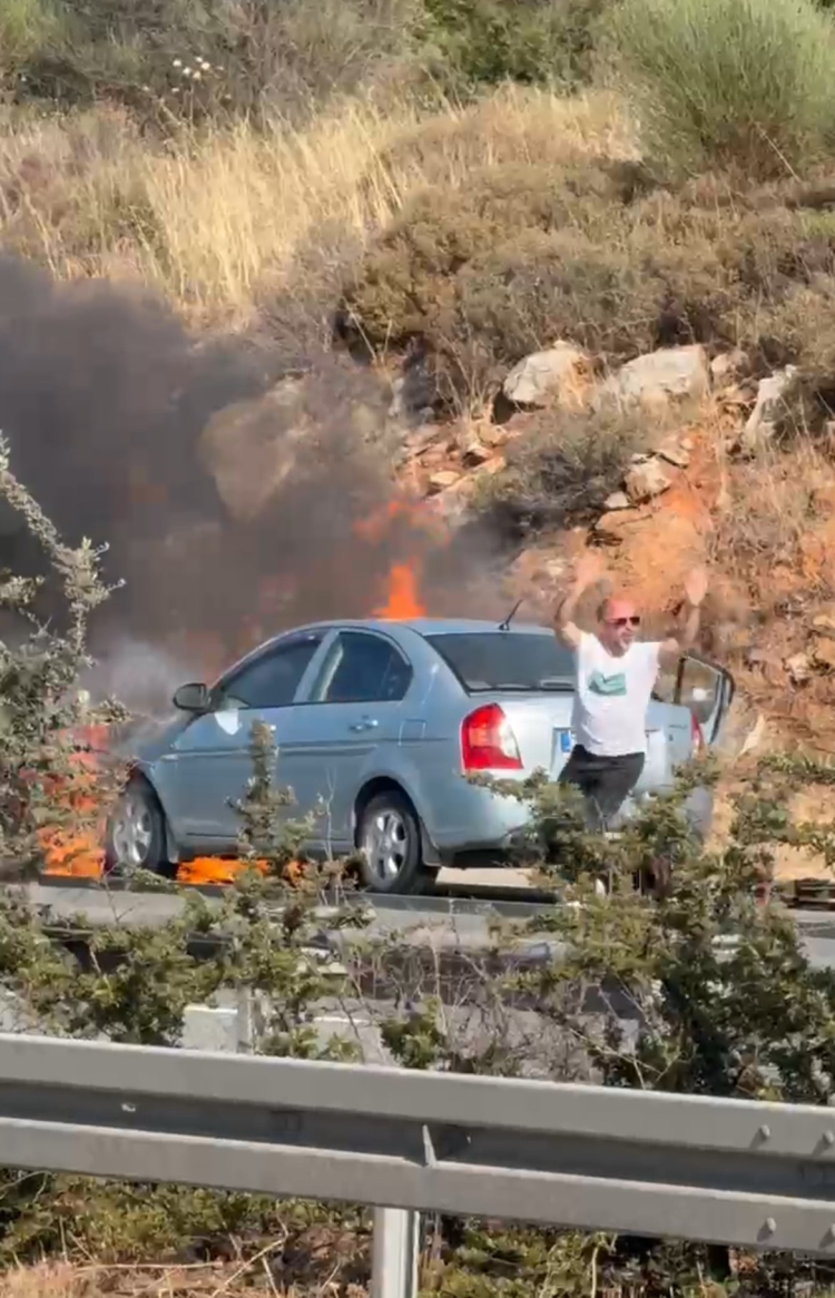 Aracından çıkan alevleri söndürmek için çevredekilerden yardım isteyen sürücü kimse durmayınca, yolun ortasında canı pahasına mücadele etti. O anlar kameraya yansıdı.
