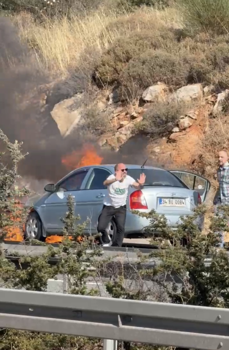 Durumu fark eden sürücü aracı emniyet şeridine çekerek kendini dışarı attı. Alevlerin sardığı otomobilin sürücüsü ise çevredekileri durdurup yardım istedi ama kimse oralı olmadı. Bir süre sonra duran bir vatandaş ilk müdahaleyi yangın tüpleriyle yaptı. İhbar üzerine olay yerine sevk edilen itfaiye ekipleri yangını kontrol altına alarak tamamen söndürdü.