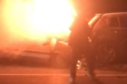 Öte yandan, meydana gelen feci kazada alev topuna dönen otomobilin kaput kısmına savrulan Saadet Kaba’nın yanarak hayatını kaybettiği acı anlar cep telefonu kamerasına saniye saniye yansıdı. Görüntülere bir kişinin, “Ah Salim ağabeyim, Saadet yengem" dediği ve bölgede yaşanan panik yansıdı.