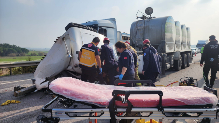 Bursa'da aynı istikamette seyreden tıra arkadan çarpan süt tankerinin sürücüsü, kabin içerisinde sıkıştı.