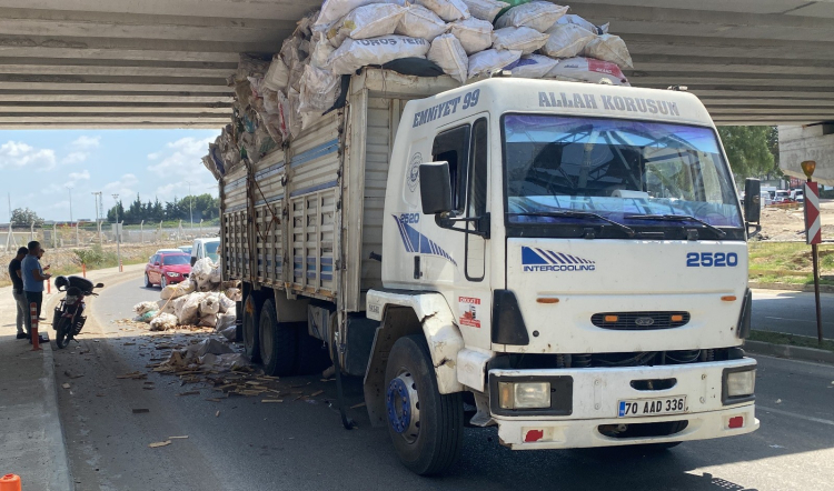 Adana'da seyir halindeki kamyon köprü altında sıkıştı. Sıkışan kamyonda yüklü onlarca çuval arkasındaki araca zarar vererek yola saçıldı.