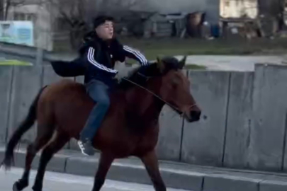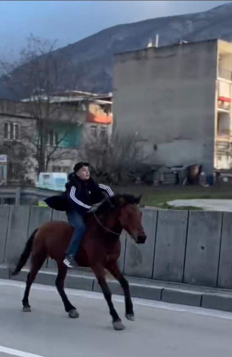 Bursa'nın Yıldırım ilçesinde 15-16 yaşlarındaki bir genç bindiği atıyla trafiğe çıktı. Sol şeritten dört nala koşturduğu atıyla kilometrelerce ilerleyen genç, trafikte seyreden otomobil sürücülerini şaşkına çevirdi. Bazı sürücüler de ilginç anları ölümsüzleştirip atın arkasında yoluna devam etti. Amatör kameralara yansıyan genç, dört nala koştuğu atıyla bir süre ilerledikten sonra kayıplara karıştı.
