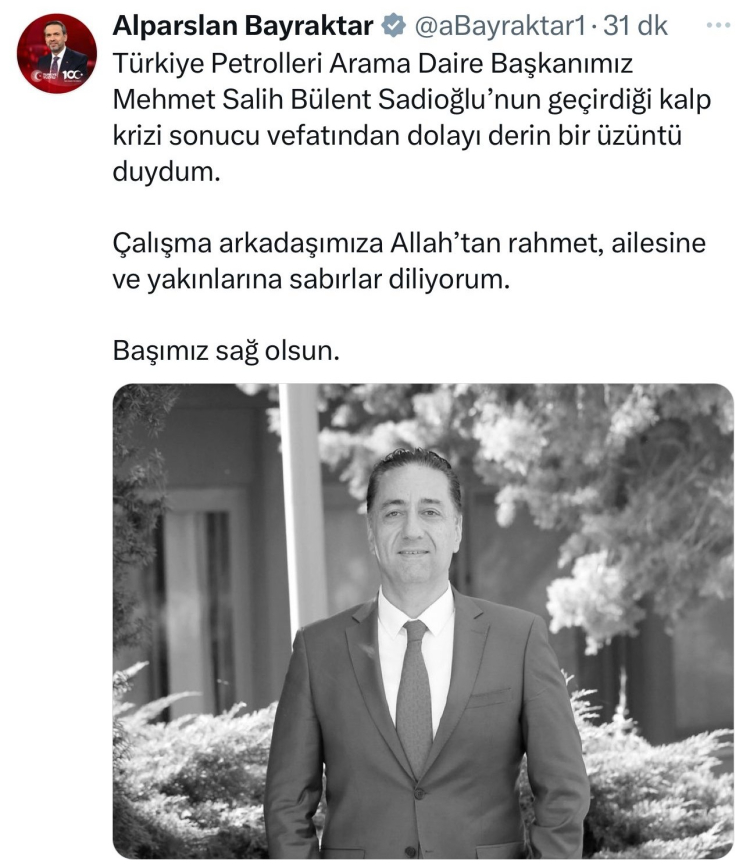 Enerji ve Tabii Kaynaklar Bakanı Alparslan Bayraktar X hesabında yaptığı açıklamada, “Türkiye Petrolleri Arama Daire Başkanımız Mehmet Salih Bülent Sadioğlu’nun geçirdiği kalp krizi sonucu vefatından dolayı derin bir üzüntü duydum. Çalışma arkadaşımıza Allah’tan rahmet, ailesine ve yakınlarına sabırlar diliyorum. Başımız sağ olsun” ifadelerini kullandı