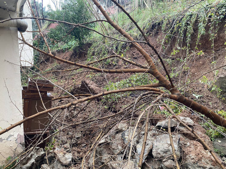Bursa'nın Osmangazi ilçesinde etkili olan yoğun yağışlar nedeniyle bir binanın yanında bulunan istinat duvarı çöktü. Duvarın yıkılmasıyla birlikte bazı ağaçlar kökünden sökülerek binaya doğru devrildi.