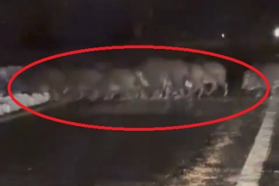 Bursa’nın dağ ilçelerinden Keles’te yoğun kar yağışı sonrası domuz sürüsü yiyecek aramak için karayoluna indi. O anlar anbean kameraya yansıdı.