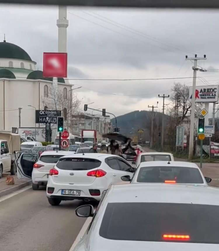 Bursa’da yol verme kavgasına tutuşan kadınlar, cadde ortasında trafiği hiçe sayarak birbirine girdi.