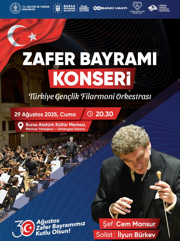 "Bir Zafer Var" temasıyla düzenlenecek kutlamalar kapsamında 29 Ağustos Cuma günü saat 20.30’da Atatürk Kültür Merkezi Merinos Yerleşkesi’nde Türkiye Gençlik Filarmoni Orkestrası, saat 21.00’de ise Kurşunlu Tahtalı Çarşı’da Çalgıcı Mektebi Orkestrası sahne alacak. 30 Ağustos’ta Göksel konseri