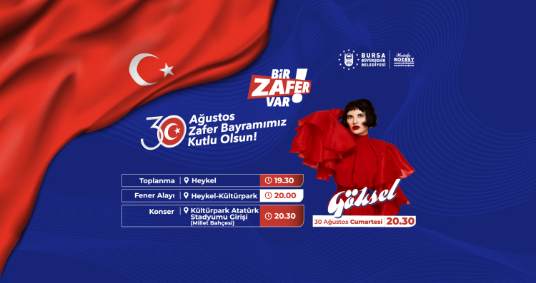 Bursa'da 30 Ağustos Zafer Bayramı, Büyükşehir Belediyesi'nin "Bir Zafer Var" temasıyla düzenleyeceği birbirinden zengin etkinliklerle büyük bir coşkuyla kutlanacak. Konserlerden sergilere, Zafer Yürüyüşü’nden film gösterimine kadar birçok programla üç gün sürecek olan kutlamalarda coşku, ‘Göksel’ konseri ile zirve yapacak.