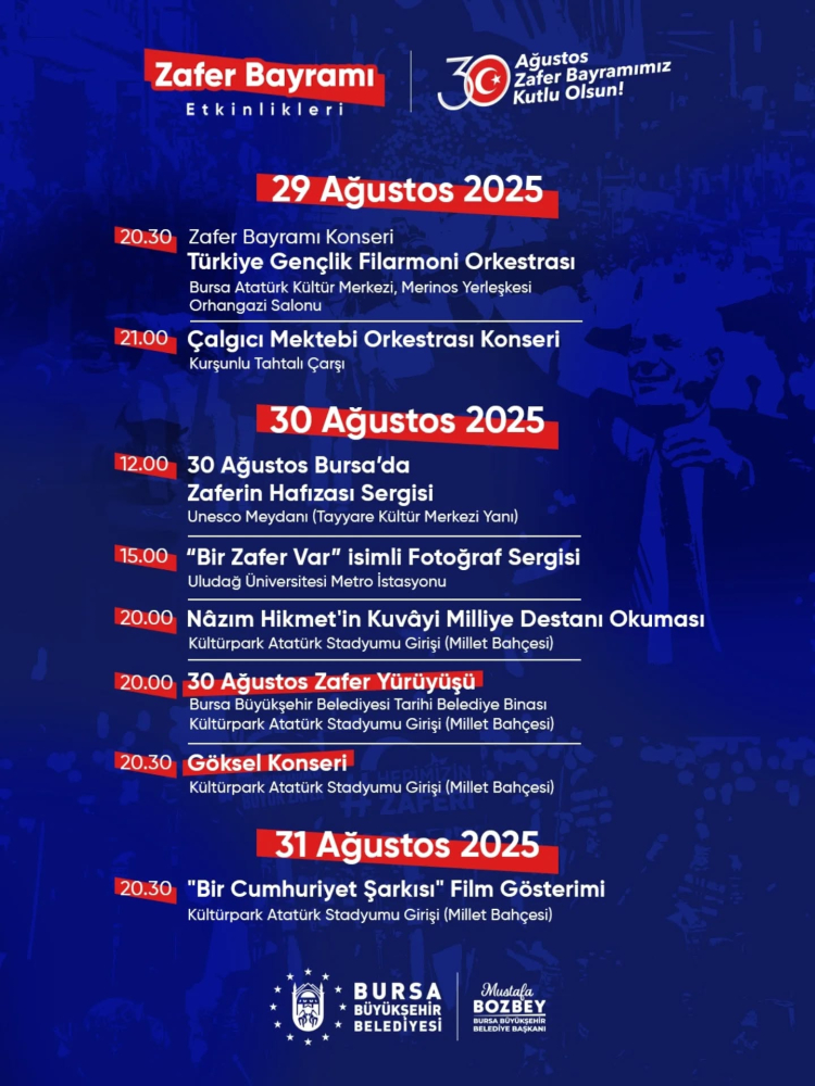 30 Ağustos Cumartesi günü ise saat 12.00’de UNESCO Meydanı’nda ’30 Ağustos Bursa’da Zaferin Hafızası’ segisi, saat 15.00’de Uludağ Üniversitesi Metro İstasyonu’nda ‘Bir Zafer Var’ fotoğraf sergisi izlenime sunulacak. ’30 Ağustos Zafer Yürüyüşü’ ise saat 20.00’de Bursa Büyükşehir Belediyesi Tarihi Belediye Binası önünden başlayarak Kültürpark Atatürk Stadyumu girişine (Millet Bahçesi) kadar sürecek. Nâzım Hikmet’in Kuvâyi Milliye Destanı’nın okunacağı Millet Bahçesi’nde, sevilen sanatçı Göksel’in sahne almasıyla coşku doruğa çıkacak. 31 Ağustos Pazar günü ise saat 20.30’da Kültürpark Atatürk Stadyumu girişinde ‘Bir Cumhuriyet Şarkısı’ film gösterimi yapılacak. Başkan Bozbey’den Bursalılara davet