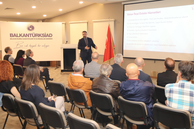 BALKANTÜRK Akademi etkinlikleri kapsamında düzenlenen ve dernek merkezinde gerçekleştirilen programda konuşmacı olarak yer alan Value Mortgage Kurucusu Emrah Erdem Dilsizoğlu, Amerika Birleşik Devletleri’nde yatırım fırsatları konusunda sunum yaptı.
