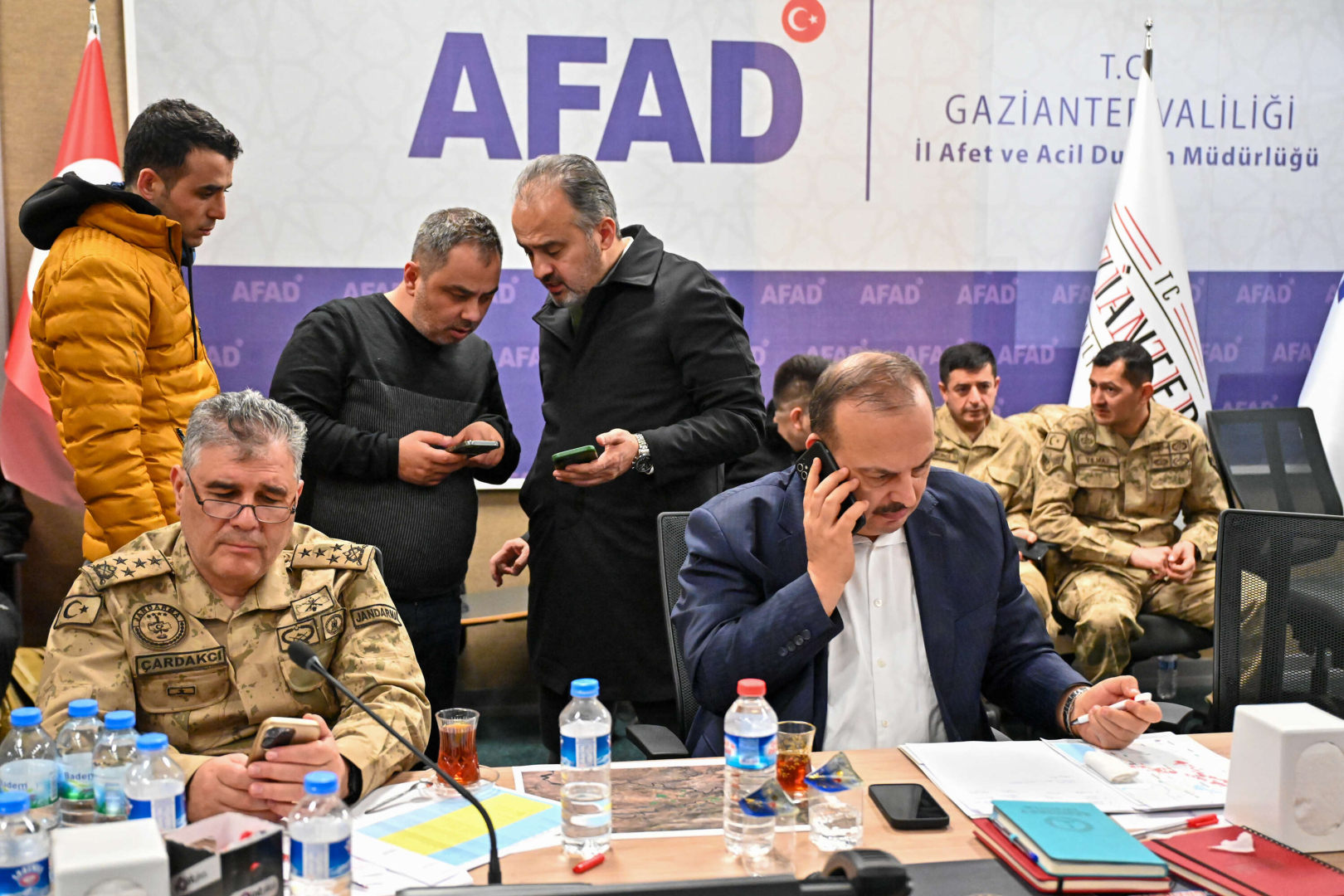 Ağır kış şartlarına rağmen yaraların sarılması için büyük gayretle çalışıldığını ifade eden Başkan Aktaş, “Ben ve Bursa valimiz, İçişleri Bakanlığımızın talimatıyla bölgeye görevlendirildik. Valimiz kriz merkezinde, ben ise Nurdağı ve İslahiye bölgeleriyle alakalı çalışıyorum. Mardin, Şırnak ve Amasya valilerimiz de burada. Bursa olarak, iş makinelerimiz ve beraberinde gıda yardımlarımızla buradayız. 3 aş evi Nurdağı, 3 aşevi de İslahiye’de açtık. Büyük seferberlik var. Ancak, bölgeye gelmek isteyenlerle alakalı söylüyorum. Buraya gelip kuru kalabalık oluşturmasınlar. Nitelikli arama kurtarma ekipleri olursa, onlar işe yarayabilir. İş makinesi gönderme konusunda da AFAD’la irtibata geçmeden asla böyle bir şey yapmasınlar. İkinci el eşya göndermesinler. Çadır, battaniye, şapka, kaşkol ve beraberinde su, ekmek, çorba, makarna gibi hızlı tüketim maddeleri kıymetli. Zaten detaylı yemek pişirilecek bir ortam yok. Hamdolsun bu sabahtan itibaren yardımlarla ilgili yoğun bir sirkülasyon başladı. Göçük altından kurtarılanların haberini aldığımız gibi maalesef vefat eden kardeşlerimize de şahit oluyoruz. Acımız büyük. Ama ülkemizin ‘çok ciddi bir elbirliği içerisinde’ sürece özel ilgi göstermesi sevindirici. Türk milleti olarak, acıda ve tatlıda bir arada olması bilen insanlarız. Hepimize büyük geçmiş olsun, başımız sağ olsun” şeklinde konuştu.