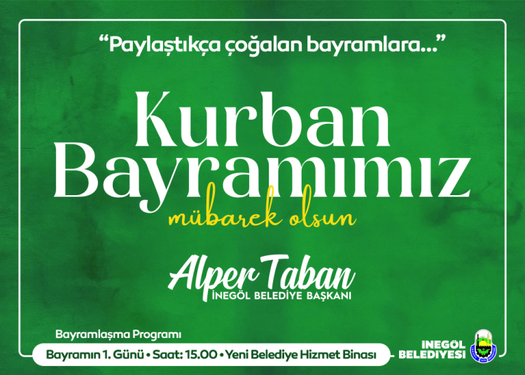 Mesajını barış, huzur ve sağlık temennileriyle tamamlayan İnegöl Belediye Başkanı Alper Taban, “Bu mübarek Kurban Bayramı’nın, ülkemize, milletimize ve tüm İslam âlemine hayırlar getirmesini diliyor; tüm vatandaşlarımızın bayramını en içten duygularımla kutluyorum. Bayramımız mübarek olsun” ifadelerini kullandı.