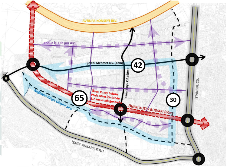 Projenin en önemli bileşenlerinden biri de 65 metre genişliğindeki Kuzey Bulvarı. Sağlıksız yapılaşmış bölgelerin dönüştürülmesiyle oluşturulacak bulvar, 29 km uzunluğunda 65 metre genişliğinde olacak şekilde kilometreler boyunca kesintisiz devam edecek. Kuzey Bulvarı, kentsel dönüşüm alanlarını kapsayan ve ekolojik temelli tasarım bölgesinden geçen ana ulaşım omurgası olacak. Ulaşım, kentsel dönüşüm ve yeşil altyapı kararları bütüncül bir bakış açısıyla ele alınacak. Bulvar, kent içi trafiği düzenlerken aynı zamanda yeşil sistemle entegre olacak.