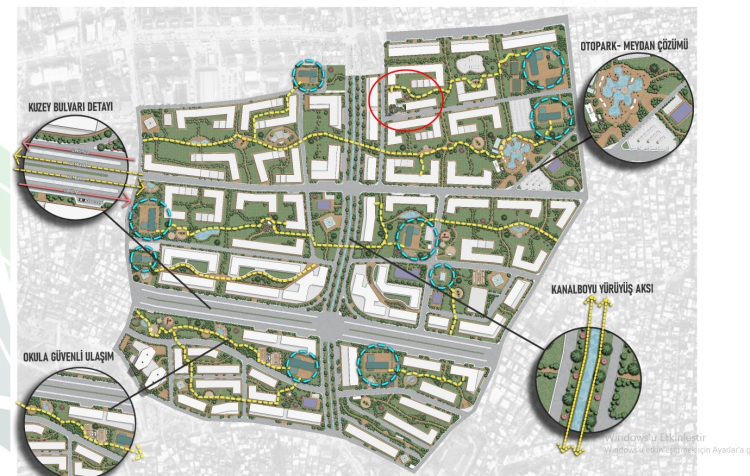 Projede ayrık nizam yerine blok nizam tercih edilerek imar adaları büyütüldü. Bahçe duvarlarının kaldırılmasıyla birlikte kullanılmayan yan bahçeler ve önceki sistemde yol olarak ayrılan alanlar yeşil sisteme dahil edildi. Böylece, büyük yeşil sistem üzerine kurulu imar adaları oluşturuldu. 20-30 hektarlık parçacıl imar adaları uygulanabilir şekilde tasarlandı. Bu adaların çevresi en az 30 metre genişliğinde araç yollarıyla çevrilecek. Parklar, sosyal donatı alanları ve eğitim yapıları kesintisiz yeşil yaya akslarıyla birbirine bağlanacak. Proje sayesinde çocukların okula 1-2 km mesafeyi araç trafiğinden arındırılmış güvenli yaya yollarıyla yürüyerek ulaşması sağlanacak.