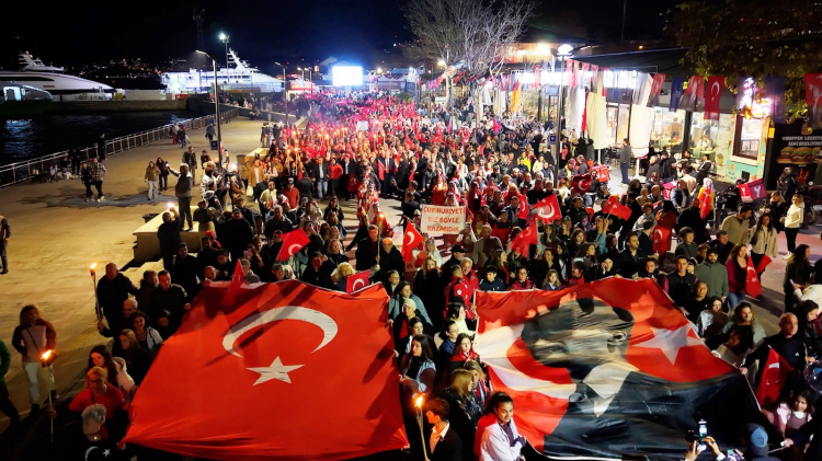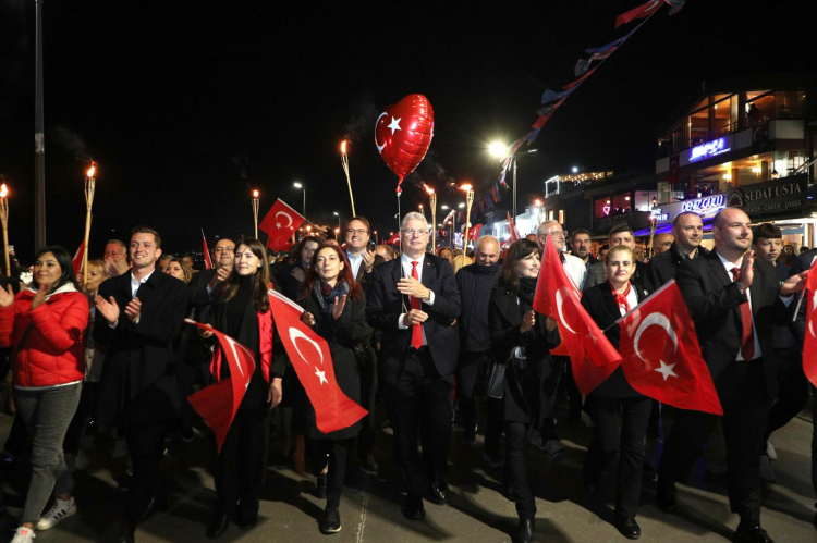 Saat 19.00’da İskele Meydanı’ndan başlayan “Biz Cumhuriyetiz Yürüyüşü” ise, bir halk seline dönüştü. Kırmızı-beyaz renklerle dolan sahil bandında, gençler, çocuklar ve yaşlılar ellerinde bayraklarla yürüdü. Marşlar eşliğinde süren yürüyüşün ardından meydanda düzenlenen “Adımlarının İzindeyiz- Cumhuriyet Valsi” renkli görüntülere sahne oldu. Mudanyalı çiftlerin meydanda Cumhuriyet’in ritminde dans ettiği anlar, uzun süre alkışlandı. Ardından sahnelenen zeybek gösterisi coşkuyu doruğa taşıdı, izleyenlere duygusal anlar yaşattı.