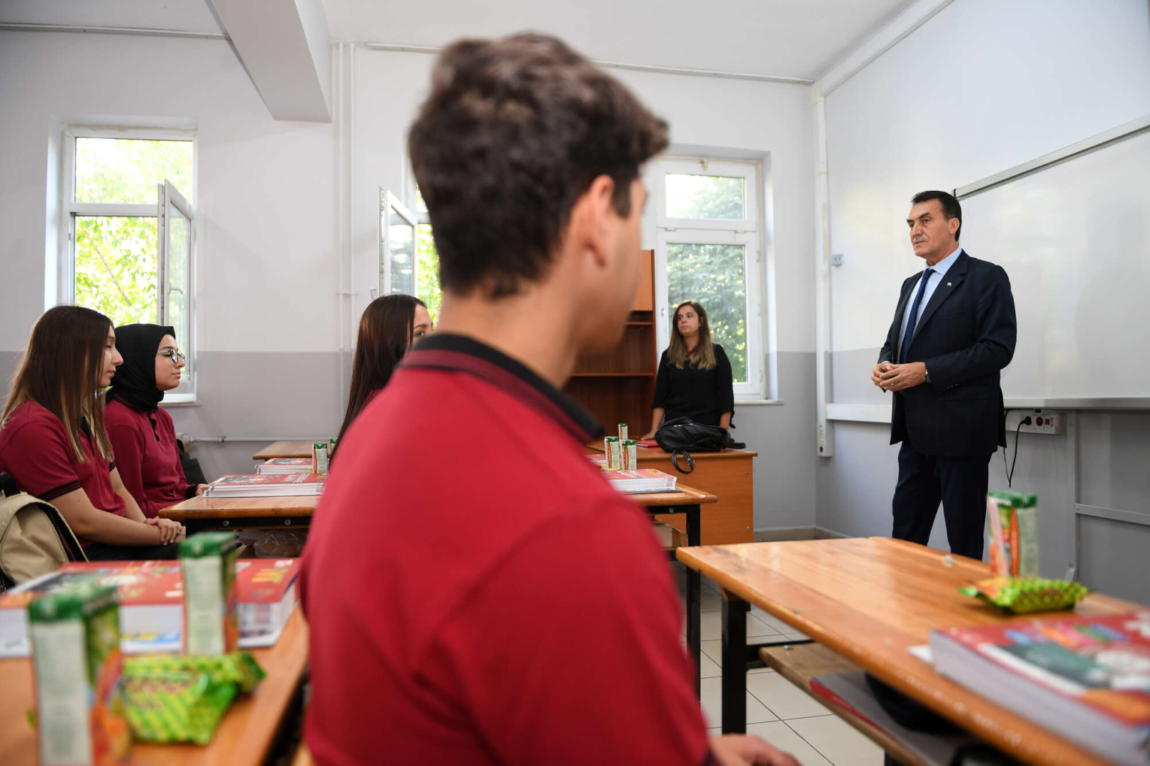 Osmangazi İlçe Milliği Eğitim Müdürü Gürhan Çokgezer ile birlikte sınıfları gezen Başkan Dündar, sohbet ettiği öğrencilere üniversiteye hazırlık yardım kitap seti hediye etti.