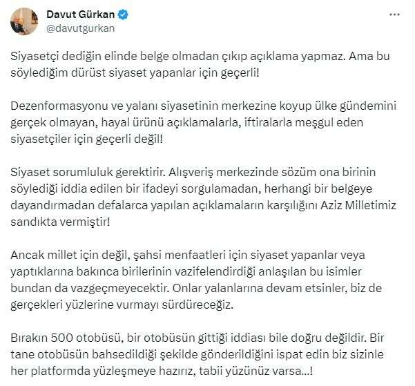 AK Parti Bursa İl Başkanı Davut Gürkan, Ümit Özdağ’ın yaptığı iddiaların asılsız olduğunu belirterek, “Siyasetçi dediğin elinde belge olmadan çıkıp açıklama yapmaz. Ama bu söylediğim dürüst siyaset yapanlar için geçerli. Dezenformasyonu ve yalanı siyasetinin merkezine koyup ülke gündemini gerçek olmayan, hayal ürünü açıklamalarla, iftiralarla meşgul eden siyasetçiler için geçerli değil. Siyaset sorumluluk gerektirir. Alışveriş merkezinde sözüm ona birinin söylediği iddia edilen bir ifadeyi sorgulamadan, herhangi bir belgeye dayandırmadan defalarca yapılan açıklamaların karşılığını aziz milletimiz sandıkta vermiştir. Ancak millet için değil, şahsi menfaatleri için siyaset yapanlar veya yaptıklarına bakınca birilerinin vazifelendirdiği anlaşılan bu isimler bundan da vazgeçmeyecektir. Onlar yalanlarına devam etsinler, biz de gerçekleri yüzlerine vurmayı sürdüreceğiz. Bırakın 500 otobüsü, bir otobüsün gittiği iddiası bile doğru değildir. Bir tane otobüsün bahsedildiği şekilde gönderildiğini ispat edin biz sizinle her platformda yüzleşmeye hazırız, tabii yüzünüz varsa” dedi.