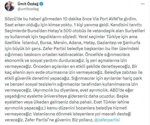Zafer Partisi Genel Başkanı Ümit Özdağ yaptığı açıklamada, “Sözcü’de bu haberi görmeden 10 dakika önce Via Port AVM’te girdim. Saat erken olduğu için kimse yoktu. 1 kişi yanıma geldi. Seçimlerde Bursa’dan Hatay’a 500 otobüs ile vatandaşlık alan Suriyelileri oy kullanmak için taşıdıklarını söyledi. Yerel seçimler Türkiye için ama özellikle İstanbul, Bursa, Mersin, Adana, Hatay, Gaziantep ve Şanlıurfa için büyük bir şans. Zafer Partisi belediye başkanları bu iller üzerindeki sığınmacı baskısını ortadan kaldıracaklar. Öncelikle sığınmacılara ekonomik ve sosyal yardımı durduracağız. İş yeri açmalarına izin vermeyeceğiz. Önceden açılanları en etkili şekilde denetleyeceğiz. Bir kaç ailenin aynı evde oturmasına izin vermeyeceğiz. Belediye zabıtası ile etkili güvenlik denetimi yapacağız. Sığınmacılar için ayrılanlar hariç park ve benzeri sosyal tesislerin sığınmacılar tarafından kullanılmasına izin vermeyeceğiz. (Ayrımcılık bu diyenlere, evet ayrımcılık. ABD’de eğer yaşadığınız eyalette üniversiteye giderseniz daha ucuzdur. Başka eyaletten veya ülkeden gelirseniz daha pahalı. Evet Türkler lehine ayrımcılık yapacağız.) kamu düzenini bozanlara belediye hizmeti vermeyeceğiz: Vatanlarına dönmek isteyenlere yol masrafı desteği vereceğiz. Zafer Partisi’ne güvenin: Biz yollarız” dedi.