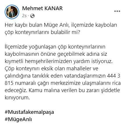 Bursa'nın Mustafakemalpaşa Belediye Başkanı Mehmet Kanar, bugün yaptığı paylaşımda Müge Anlı’ya seslendi. Bugüne kadar onlarca çöp konteynerinin kaybolması üzerine çaresizlik içinde kalan Başkan Kanar’ın talebi sosyal medyada büyük dikkat çekti.