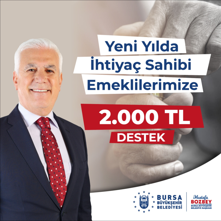 Bursa Büyükşehir Belediye Başkanı Mustafa Bozbey, emeklilerin bütçesine katkı sunmak, harcamalarına destek olmak amacıyla yeni yıl öncesinde ihtiyaç sahibi emeklilere 2’şer bin TL destek olmaya başladıklarını söyledi.