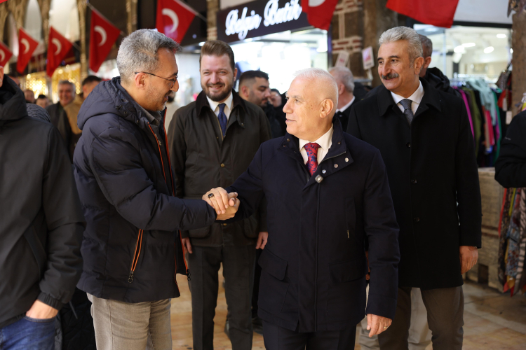 Paylaşmanın ve dayanışmanın ayı Ramazan boyunca 17 ilçede vatandaşlarla iftar sofralarında bir araya gelen Bursa Büyükşehir Belediye Başkanı Mustafa Bozbey, Ramazan Bayramı öncesi son oruç gününde de Bursa’nın kalbi konumundaki Tarihi Çarşı ve Hanlar Bölgesi’ni ziyaret etti.