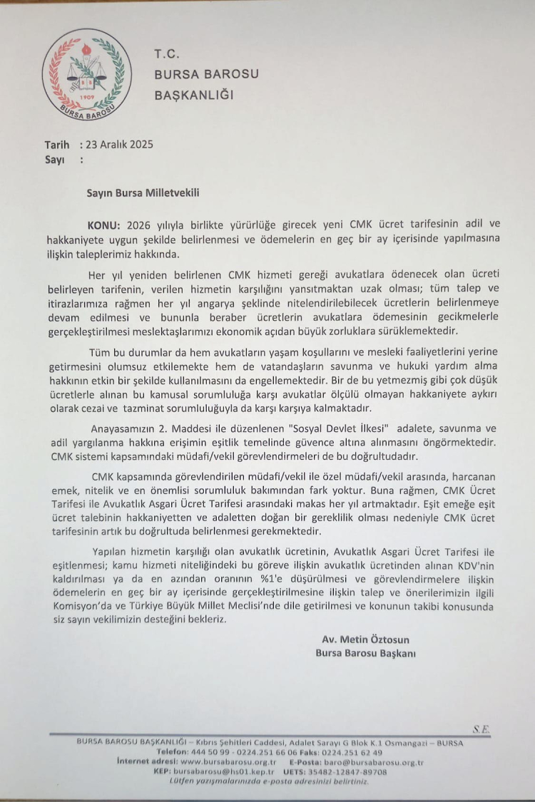 Bursa Barosu, 2026 yılıyla birlikte yürürlüğe girecek yeni CMK ücret tarifesinin adil ve hakkaniyete uygun şekilde belirlenmesi ve ödemelerin en geç bir ay içerisinde yapılmasına ilişkin talepleri içeren mektubu Bursa milletvekillerine gönderdi.