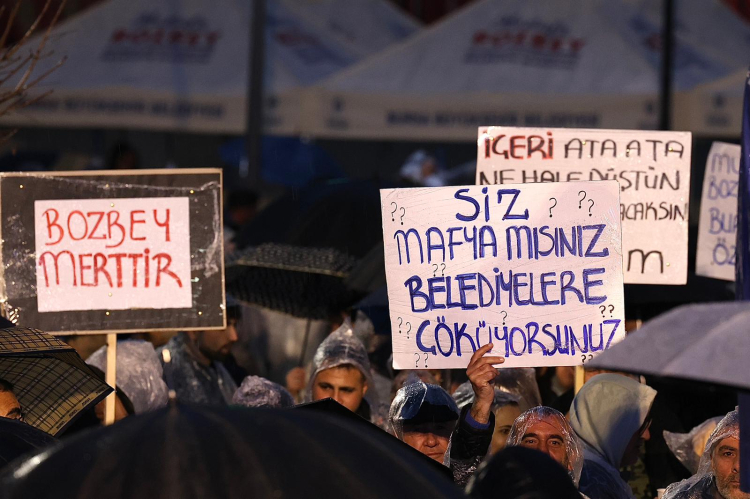 Soruşturma kapsamında, aralarında Bursa Büyükşehir Belediye Başkanı Mustafa Bozbey'in de bulunduğu 57 şüpheli hakkında uygulanan gözaltı işleminin ardından kentte protestolar sürüyor.