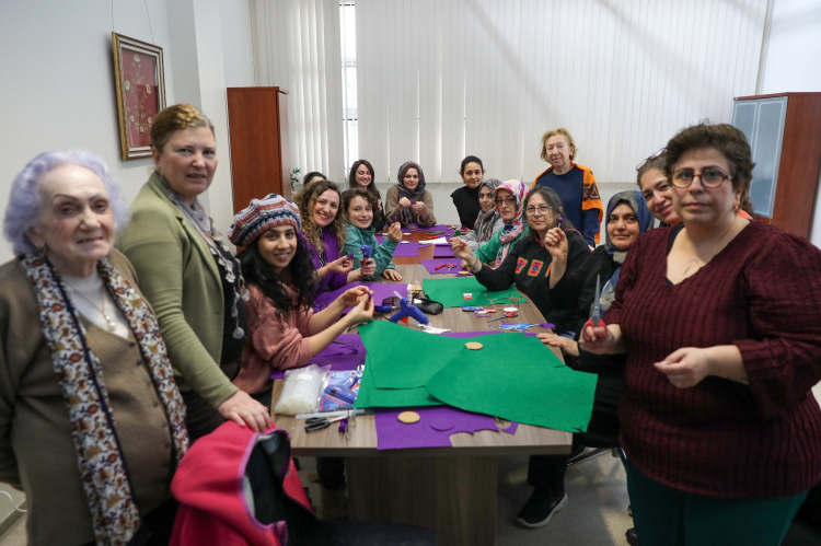 Bursa Kent Konseyi’nin 8 Mart etkinliğinde düzenlenen keçe atölyesinde kadınlar, yürüyüşte kullanılacak el emeği süs eşyaları hazırladı.