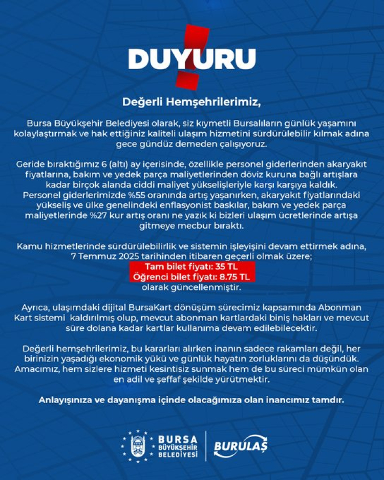 Bursa'da toplu ulaşıma zam yapıldı. Tam bilet 35 TL, öğrenci 8,75 TL oldu. BURULAŞ, Abonman Kart sisteminin kaldırıldığını duyurdu. Mevcut kartlar süre dolana kadar kullanılabilecek.