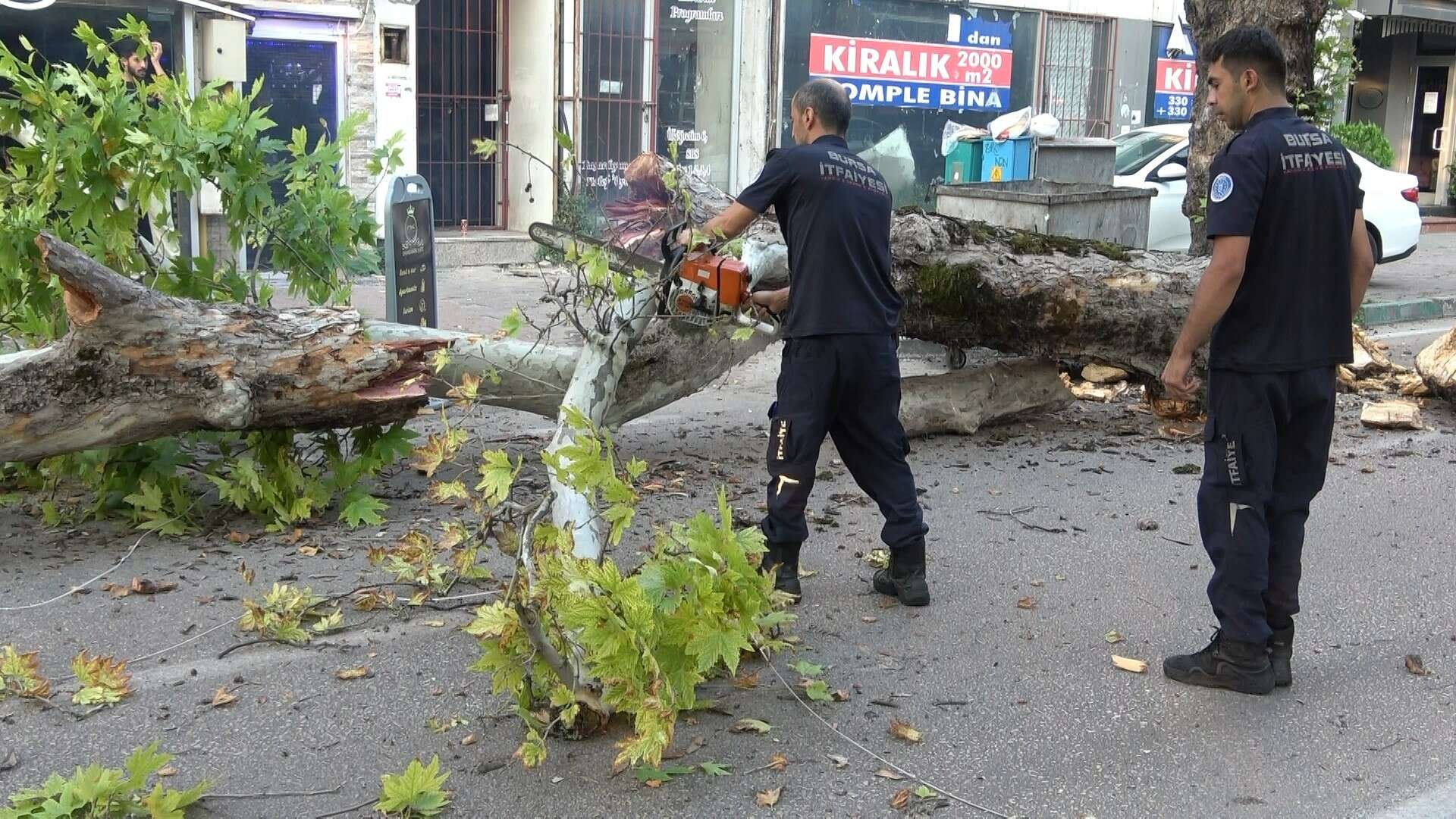 Bursa’da devasa büyüklükteki çınar ağacı kökünün çürümesi sonucunda caddeye devrildi. Cadde üzerinden kimsenin geçmemesi muhtemel bir faciayı önledi.