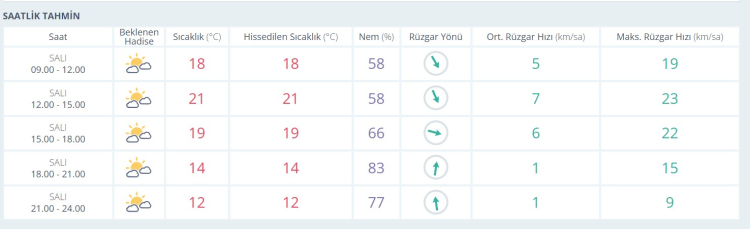 Gün içerisinde rüzgar hızının ortalama 1 ile 7 km/sa arasında değişmesi beklenirken, maksimum rüzgar hızının öğle saatlerinde 23 km/saat'e ulaşabileceği tahmin ediliyor. Bu durumun ulaşımda veya günlük yaşamda herhangi bir olumsuzluk yaratması öngörülmüyor.