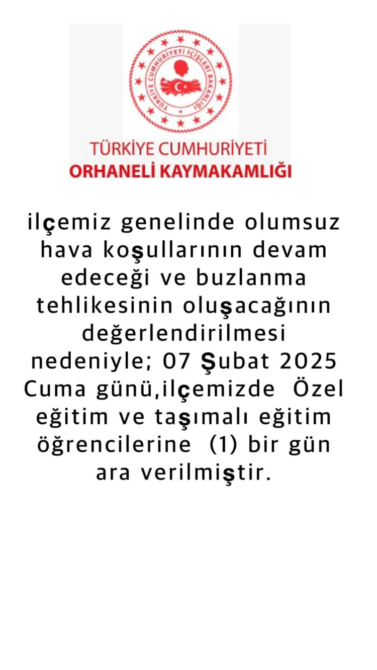 Ayrıca Orhaneli Kaymakamlığı'ndan yapılan açıklamada ise, "İlçemiz genelinde olumsuz hava şartlarının devam edeceği ve buzlanma tehlikesinin oluşacağının değerlendirilmesi nedeniyle 7 Şubat 2025 Cuma günü, ilçemizde özel eğitim ve taşımalı eğitim öğrencilerine 1 gün ara verilmiştir" denildi.