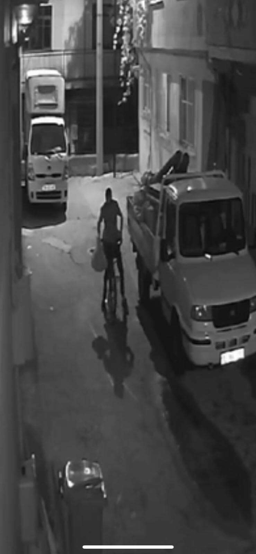 Liman sokak üzerinde bisikletiyle ilerleyen şüpheli kişi, açık kasa kamyonetin arkasındaki malzemeleri gözüne kestirdi.