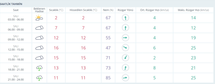 Akşam (18.00 - 21.00): Hava sıcaklığı 13°C'ye düşerken, beklenen yağmur hadisesi başlayacak. Nem oranı %73 seviyelerinde seyredecek.
