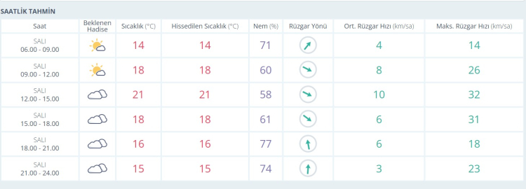 Günün en dikkat çekici detayı ise rüzgar hızı. Özellikle öğle saatlerinde (12.00 - 15.00 arası) rüzgarın hızının 32 km/sa seviyelerine kadar çıkması bekleniyor. Dışarıda olan vatandaşların ve sürücülerin rüzgarın anlık sert esintilerine karşı tedbirli olmasında fayda var.