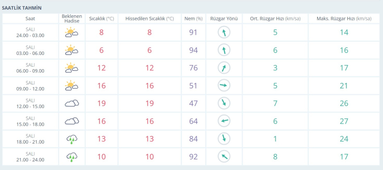 Akşamüstü (15.00 - 18.00): Bulutlanma artıyor, sıcaklık 16 dereceye geriliyor. Rüzgar hızı bu saatlerde 27 km/sa ile en yüksek seviyesine ulaşacak.