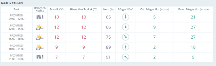 Akşam saat 18.00’den sonra sıcaklıklar tek haneli rakamlara (9°C) gerilerken, nem oranındaki artış dikkat çekiyor. Gece yarısına doğru nem oranının %91 seviyelerine çıkmasıyla birlikte hissedilen sıcaklık 7 dereceye kadar düşecek. Şehrin yüksek kesimlerinde ve ana arterlerde gece geç saatlerde pusun yeniden etkili olması bekleniyor.
