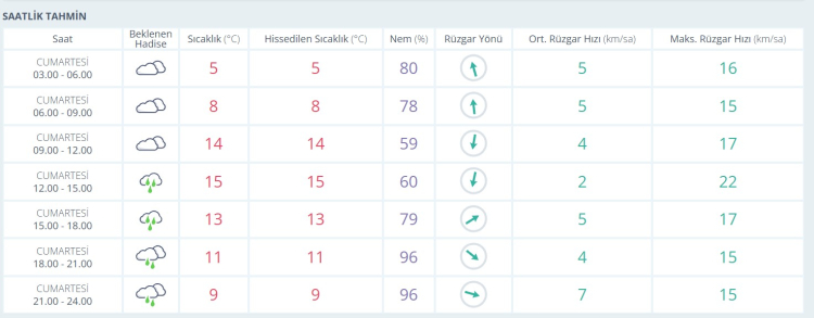 Saat 12.00 itibarıyla gökyüzündeki bulutlar yerini sağanak yağışa bırakacak. Yağışın özellikle 12.00 - 18.00 saatleri arasında etkili olması beklenirken, günün en yüksek sıcaklığı 15 derece ile öğle saatlerinde ölçülecek.