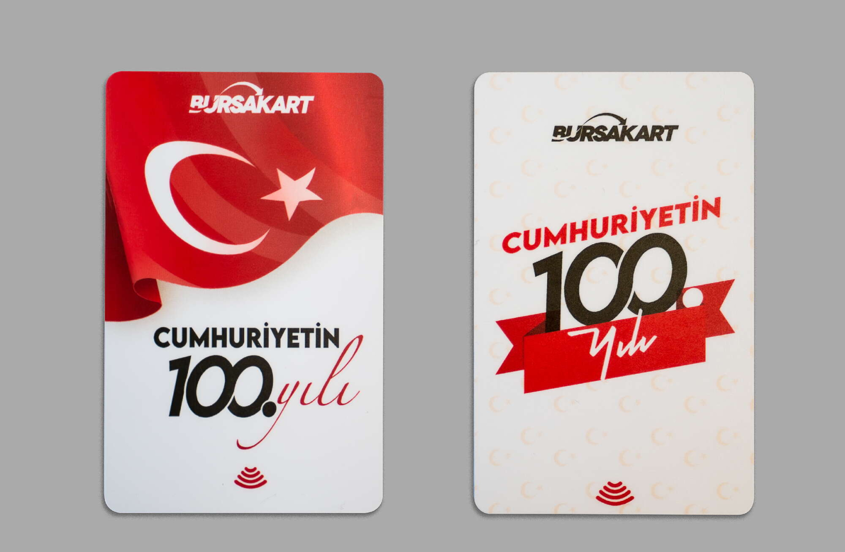 Kırmızı beyaz renklerde hazırlanan kartların birinin ön yüzünde diğerinin ise arka yüzünde Türk Bayrağı bulunuyor. Her ikisinden de 100’er bin adet basılan kartlar sayesinde Bursalılar, hem Cumhuriyet’in 100’üncü kuruluş yıldönümü hatırasını uzun yıllar yaşatacak hem de bu kartları toplu ulaşım araçlarında da kullanabilecek.