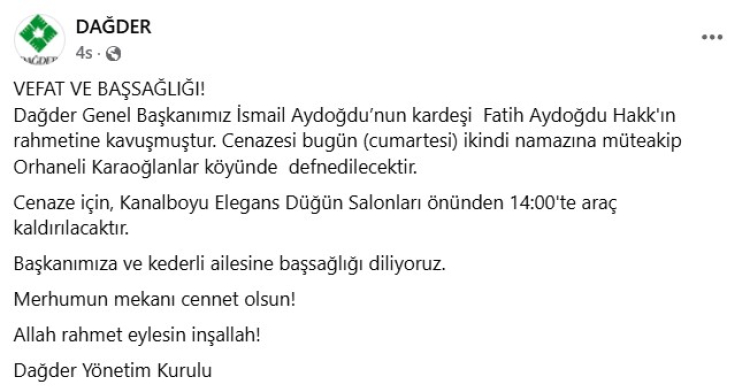 Bursa Dağ Köyleri Yardımlaşma ve Kültür Derneği (DAĞDER) Genel Başkanı İsmail Aydoğdu'nun kardeşi Fatih Aydoğdu vefat etti. Acı haberi DAĞDER Yönetim Kurulu duyurdu.