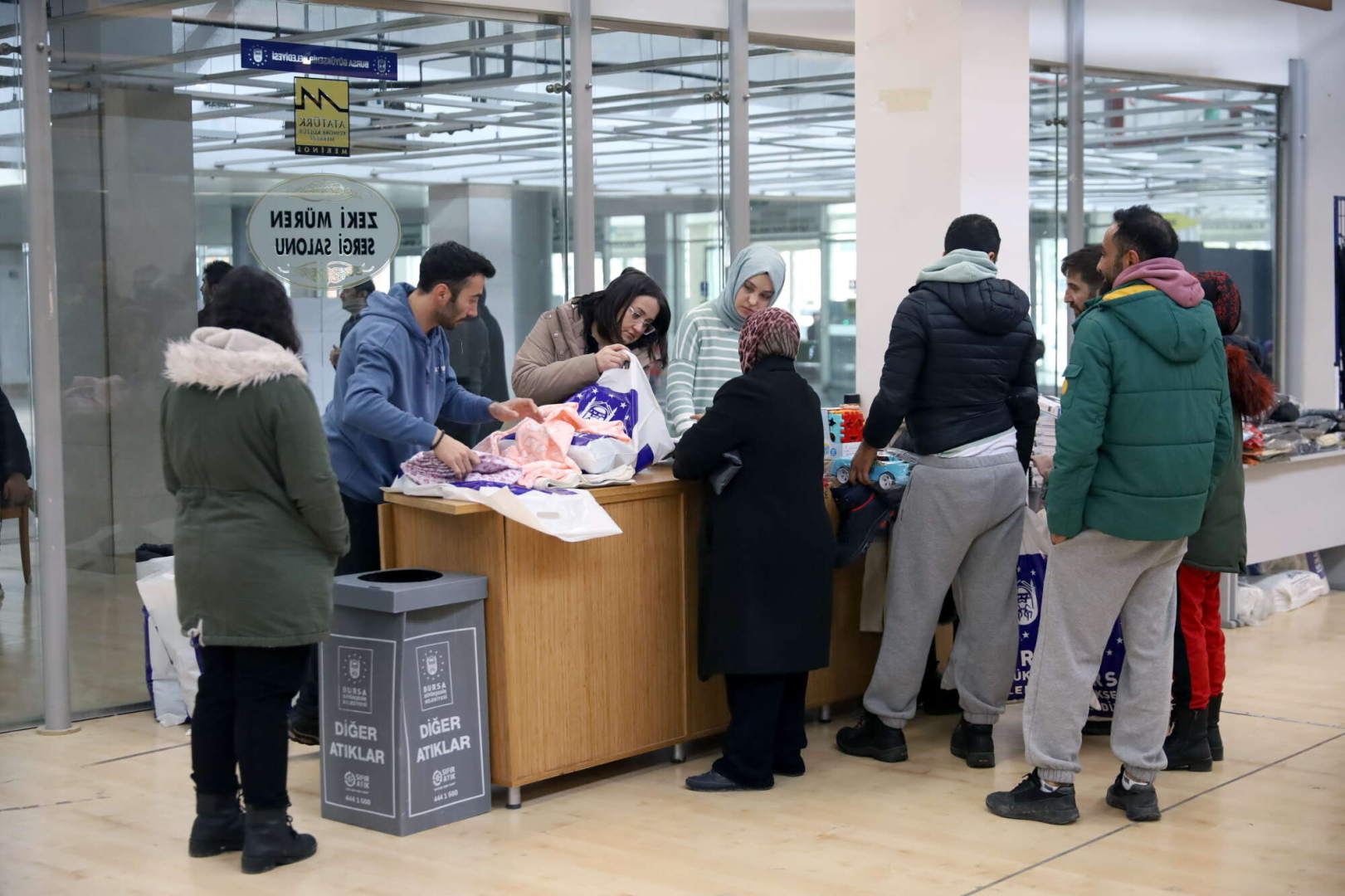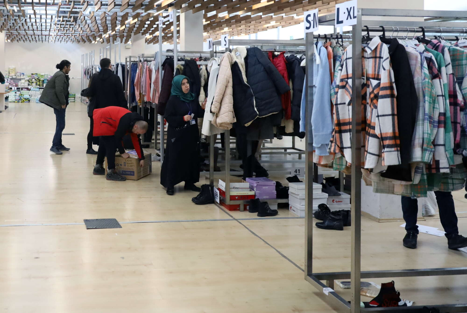 AFAD’ın kontrolünde afet bölgelerinden başka şehirlere tahliyeler düzenli olarak devam ederken, gerek akrabalarının yanına yerleşmek gerekse de hayata yeni bir başlangıç yapabilmek için Bursa’ya gelen afetzedelere Büyükşehir Belediyesi kucak açtı. Kimileri enkaz altından çıkarılan, kimileri ise akrabalarını, yakınlarını, varını yoğunu kaybedip Bursa’ya gelen deprem mağdurlarının ihtiyaçlarının karşılanması için de seferberlik başlatıldı. Kongre merkezinin sergi salonları adeta bir mağaza gibi düzenlendi. Gönüllüler tarafından getirilen yeni eşyalar burada yaş gruplarına ve bedenlerine göre asıldı. Sadece yeni eşyaların yer aldığı mağazaya gelen afetzedeler, deneyerek, beğenerek seçtikleri giyimden hijyen malzemelerine kadar tüm ihtiyaçlarını gönül rahatlığı ile alabiliyor. Tam bir hüznün hakim olduğu mağazada depremzedelerin yaşadığı korku, acı ve keder gözlerden okunuyor.