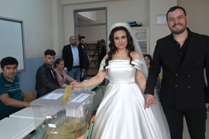 Türkiye, 13. Cumhurbaşkanını seçmek için sandığa giderken, Bursa'da da binlerce vatandaş sandığa gitti. O vatandaşlardan Ulaş Enis ve Sema Kızıldere çifti de nikahları kıyıldıktan sonra düğün eğlencelerini yarıda kesip, oy kullanmak için Şehit Hasan Hüseyin Daşdemir Orta Okulu'na geldi.