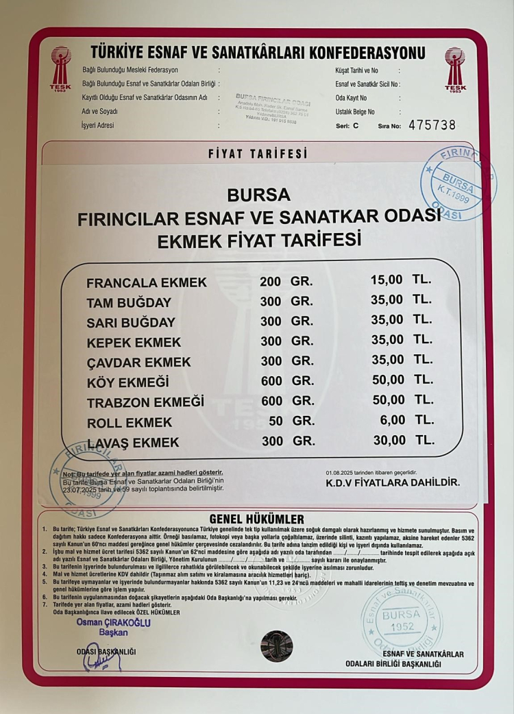 Bursa Fırıncılar Odası artan maliyetler karşısında 2 Ocak 2025 tarihinde ekmek fiyatlarına yüzde 25 zamla birlikte daha önce 10 liradan satılan 200 gram ekmeği 240 gram olarak 15 liradan satmaya başladı. Ancak, 1 Ağustos 2025 tarihinden itibaren fiyat yine 15 lira olarak kalacağı belirtilirken, 240 gram olan ekmek 200 grama düşürüldü.