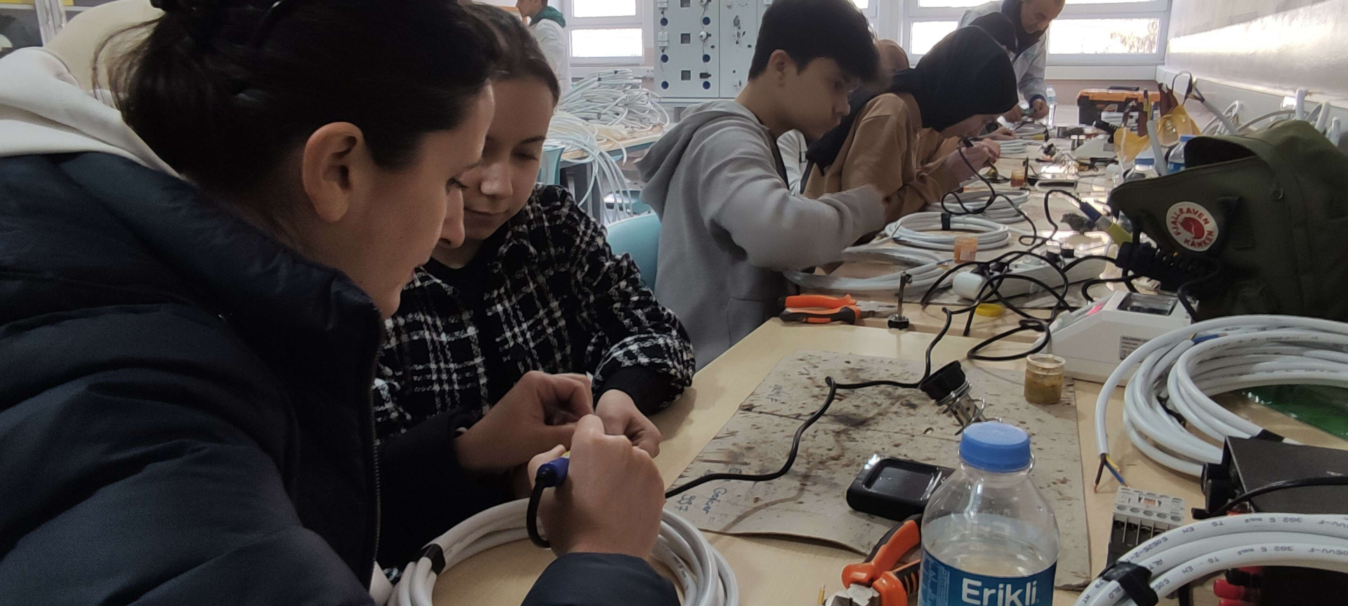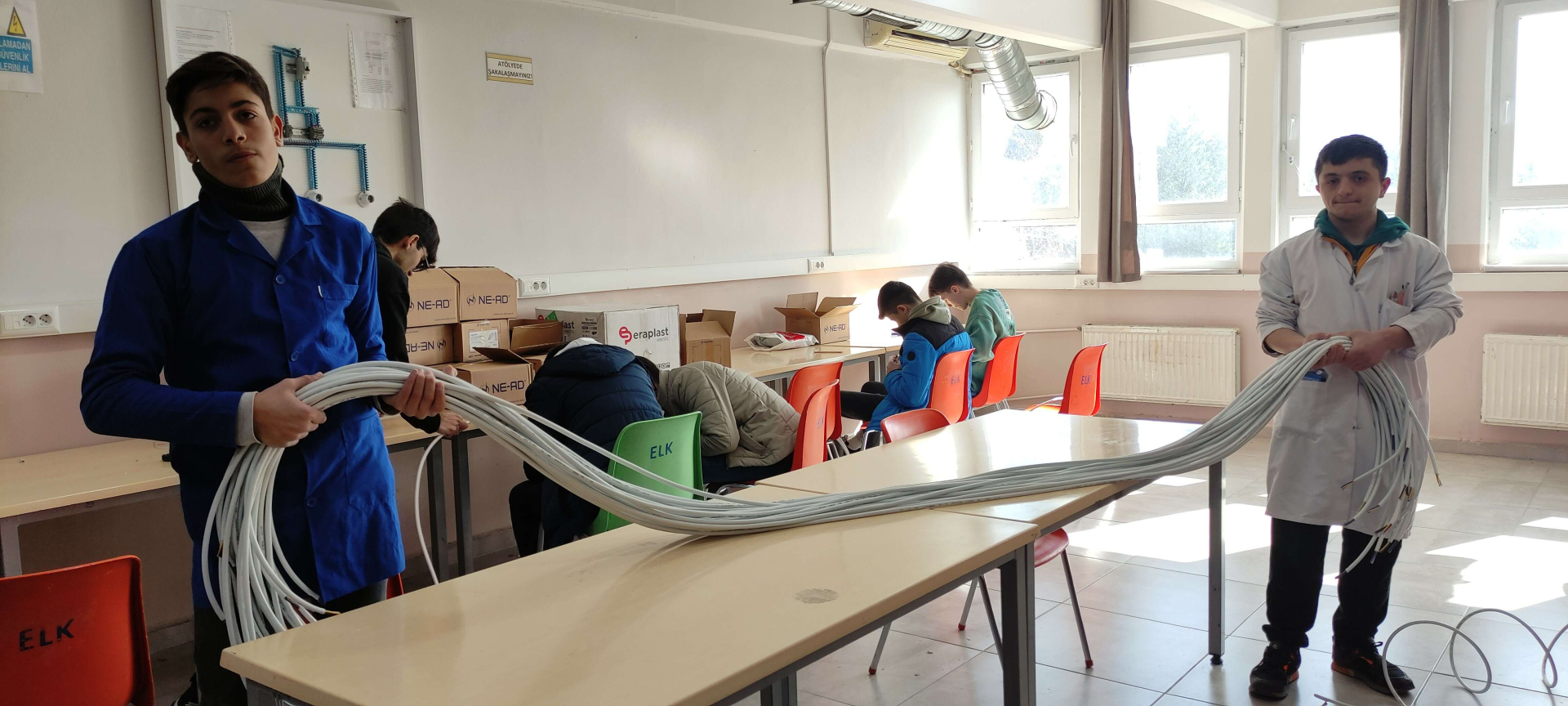 Öğretmenlerinin çağrısı üzerine okula geldiklerini ifade eden öğrenciler, "Burada okulda öğrendiğimiz bilgilerle priz üretimine başladık. Deprem bölgesindeki vatandaşlara bizde bu şekilde yardımcı olmaya çalışıyoruz" dedi.