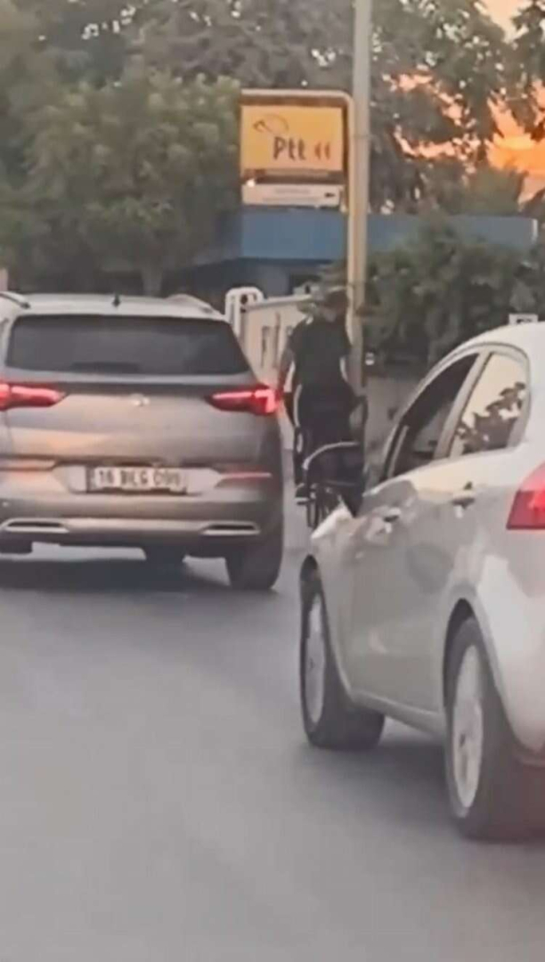 Bursa’da bir vatandaş, trafiğin aktığı caddede bisikletine ters binerek ilerledi. O anları gören sürücüler kısa süreli şok geçirse de cep telefonu kameraları ile kaydetti.