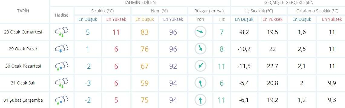 Meteoroloji Genel Müdürlüğü tarafından yapılan son değerlendirmelere göre: Ülkemiz genelinin çok bulutlu ve yağışlı geçeceği tahmin ediliyor. Yağışların; genellikle yağmur ve sağanak, Marmara’nın güneybatısı, İç Ege’nin yüksekleri, Batı Akdeniz’in iç kesimlerinin yüksekleri, İç Anadolu, Karadeniz’in iç kesimleri, Doğu Anadolu ile Güneydoğu Anadolu’nun kuzeyinde karla karışık yağmur ve kar şeklinde olması bekleniyor. Yağışların, Kıyı Ege, Batı Akdeniz, Manisa, Kocaeli, Sakarya, Düzce, Zonguldak ve Bartın çevrelerinde kuvvetli yağmur ve sağanak, Bilecik, Kayseri, Sivas, Malatya, Tunceli, Elazığ, Bingöl, Muş, Hakkari ve Bitlis çevrelerinde kuvvetli ve yer yer yoğun kar şeklinde olacağı tahmin ediliyor.