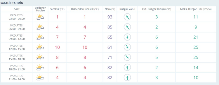 Günün en sıcak saatleri ise 12.00 ile 15.00 arasında yaşanacak. Termometrelerin 10 dereceyi göstereceği bu dilimde, rüzgarın güney yönlerden hafif esmesi bekleniyor. Maksimum rüzgar hızının yer yer 25 km/sa hıza ulaşabileceği tahmin ediliyor.